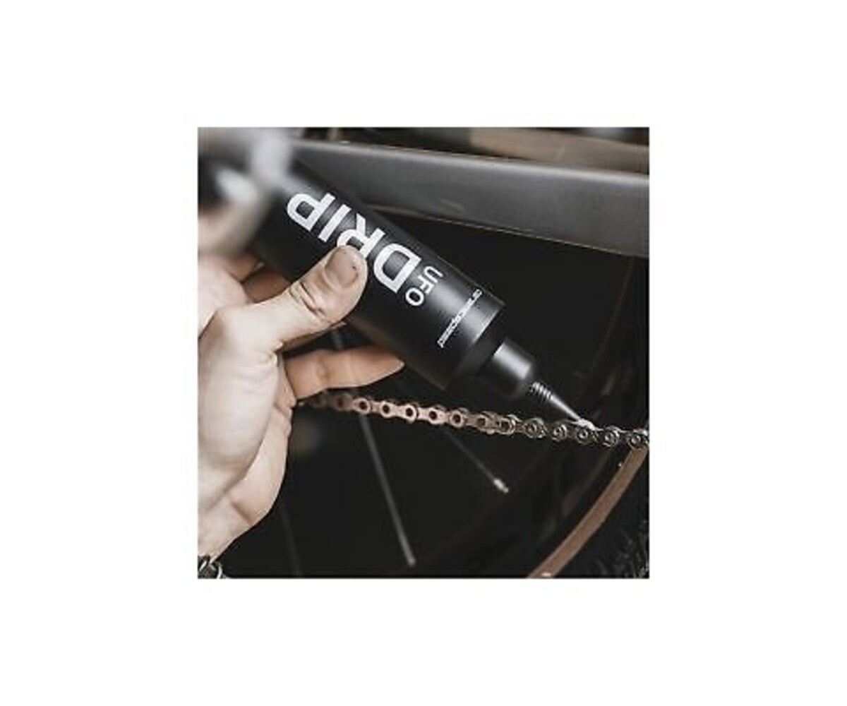 UFO chain lubricant hardens to a 100% dry coating to protect against unwanted contaminants, which results in a quieter drivetrain, reduced friction and component wear.