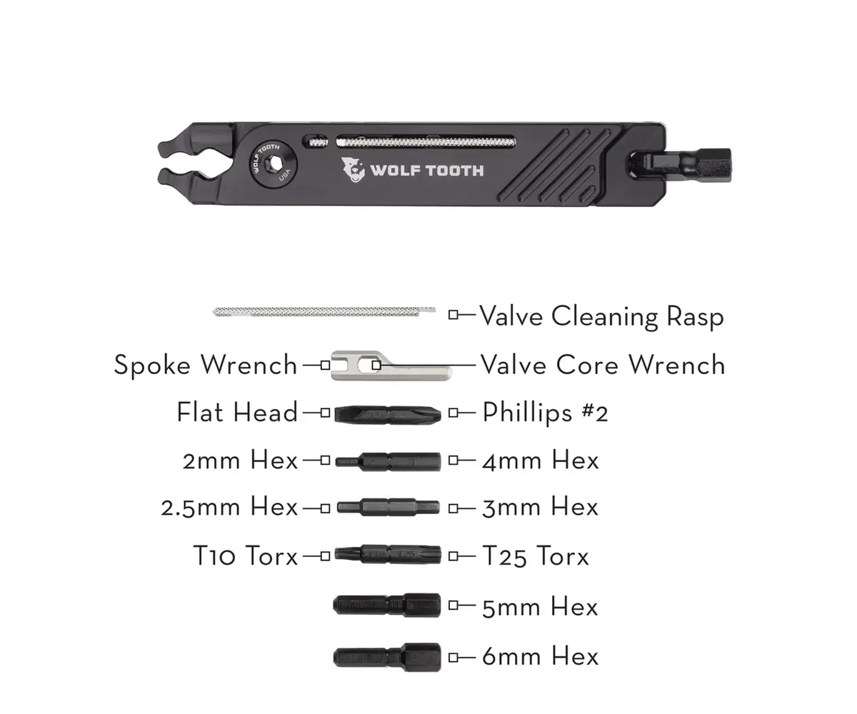 - 17 functions: spoke wrench; valve core wrench; flat head #3.5 and Phillips #2 screwdriver bits; 2, 2.5, 3, 4, 5, 6, and 8mm hex; and T10, T25 Torx-compatible bits; install and remove master links; clear tire sealant clogs from valve stem; tighten valve stem lock nut